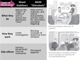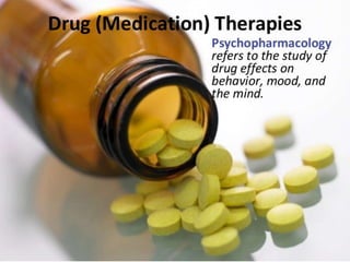 Therapy methods have evolved over time from institutionalization to community-based treatment. There are various forms of psychotherapy including psychoanalysis, humanistic, behavior, and cognitive therapies. Psychotherapy involves interaction with a trained professional to understand and change behavior, thinking, relationships, and emotions. Current therapies also include biomedical approaches using medications and procedures, as well as combining therapies to fit each client's specific needs.