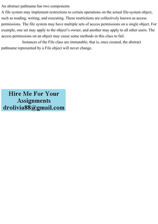 The document discusses various Java Input/Output classes, including Writer, BufferedInputStream, BufferedOutputStream, and File. It provides a detailed focus on the File class, highlighting its role as an abstract representation of files and directories, along with the restrictions imposed by access permissions. Additionally, it notes that instances of the File class are immutable once created.