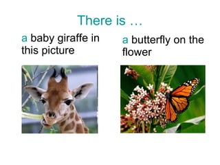 The document discusses using there is/are to identify singular or plural nouns in sentences and questions. It provides examples of sentences containing baby giraffes, butterflies, elephants, planes, goats and ducks to illustrate plural nouns using "there are". Examples of questions with singular nouns like rabbit and plural nouns like apples or corals are given to demonstrate answering with "yes, there is/are" or "no, there isn't/aren't".