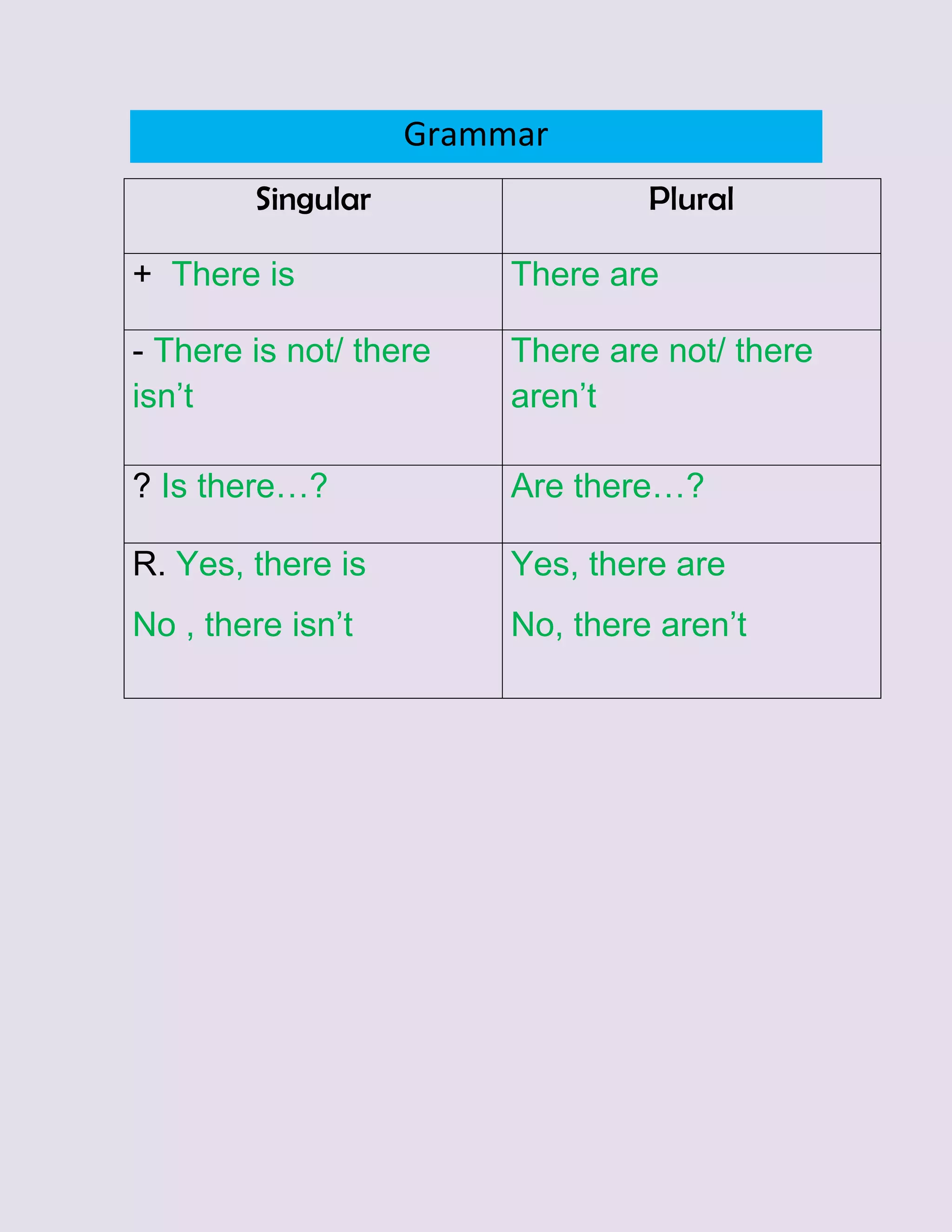 The document provides examples of using singular and plural forms of verbs and subjects in English. It gives 12 examples sentences with blanks to be filled in with either "There is" or "There are" depending on whether the subject is singular or plural. The answers are then given, correctly filling in the blanks in each sentence with the appropriate singular or plural verb form.