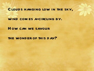 The song encourages people to appreciate each day, as life passes quickly. It suggests laying down burdens, singing your own song in life, and finding your heart where your treasures are - whether that's laughter with friends, caring for the environment, or offering your gifts to help others. No matter what brings you joy or what causes you devote yourself to, that is where your heart truly lies.