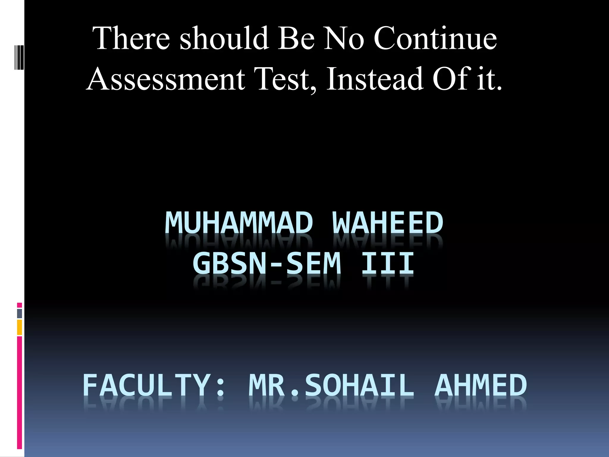This document discusses alternatives to continuous assessment tests (CATs) for evaluating student progress, including portfolios, debates, presentations, oral exams, student projects, and posters. It notes some potential drawbacks of CATs, such as causing stress and not assessing a complete understanding of the material. Portfolio assessment is proposed as an alternative that more closely resembles instructional activities. Presentations, debates, and oral exams provide experience for future situations while projects help students link theories to practice. Overall, the document analyzes different assessment methods and their ability to fully and accurately evaluate student learning.