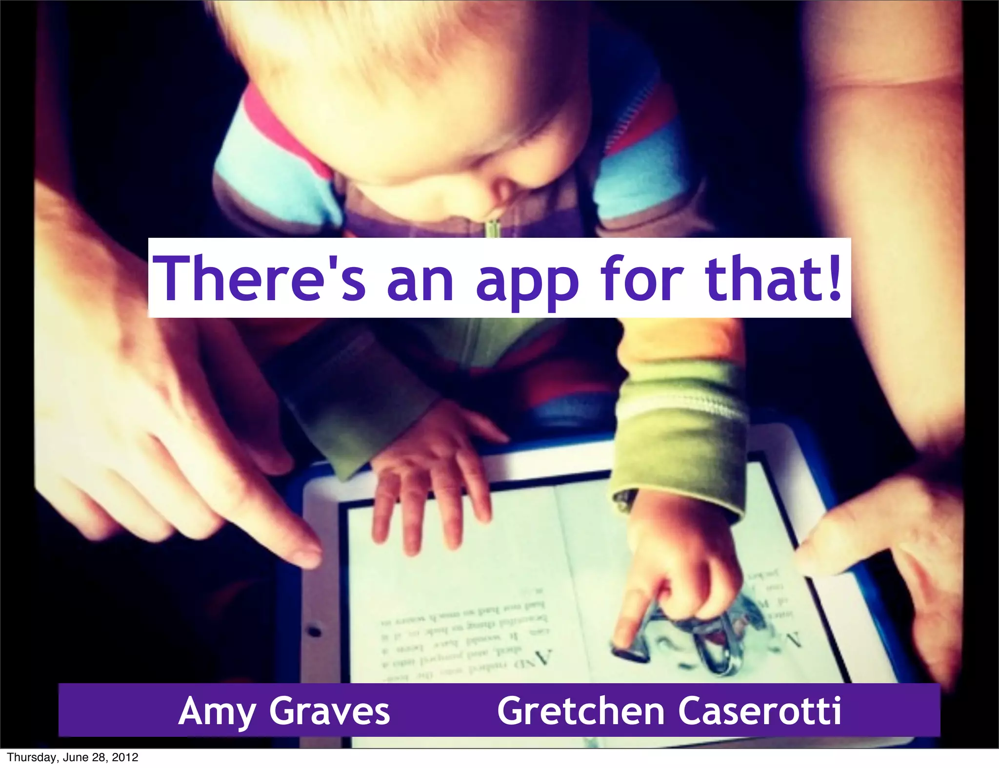 The document discusses various technology programs and apps for enhancing literacy and learning in public libraries, focusing on initiatives for children and adults. It highlights different storytime formats incorporating iPads, as well as recommended apps for reading and creative activities. Additionally, there are descriptions of coding clubs and suggestions for finding quality educational apps.