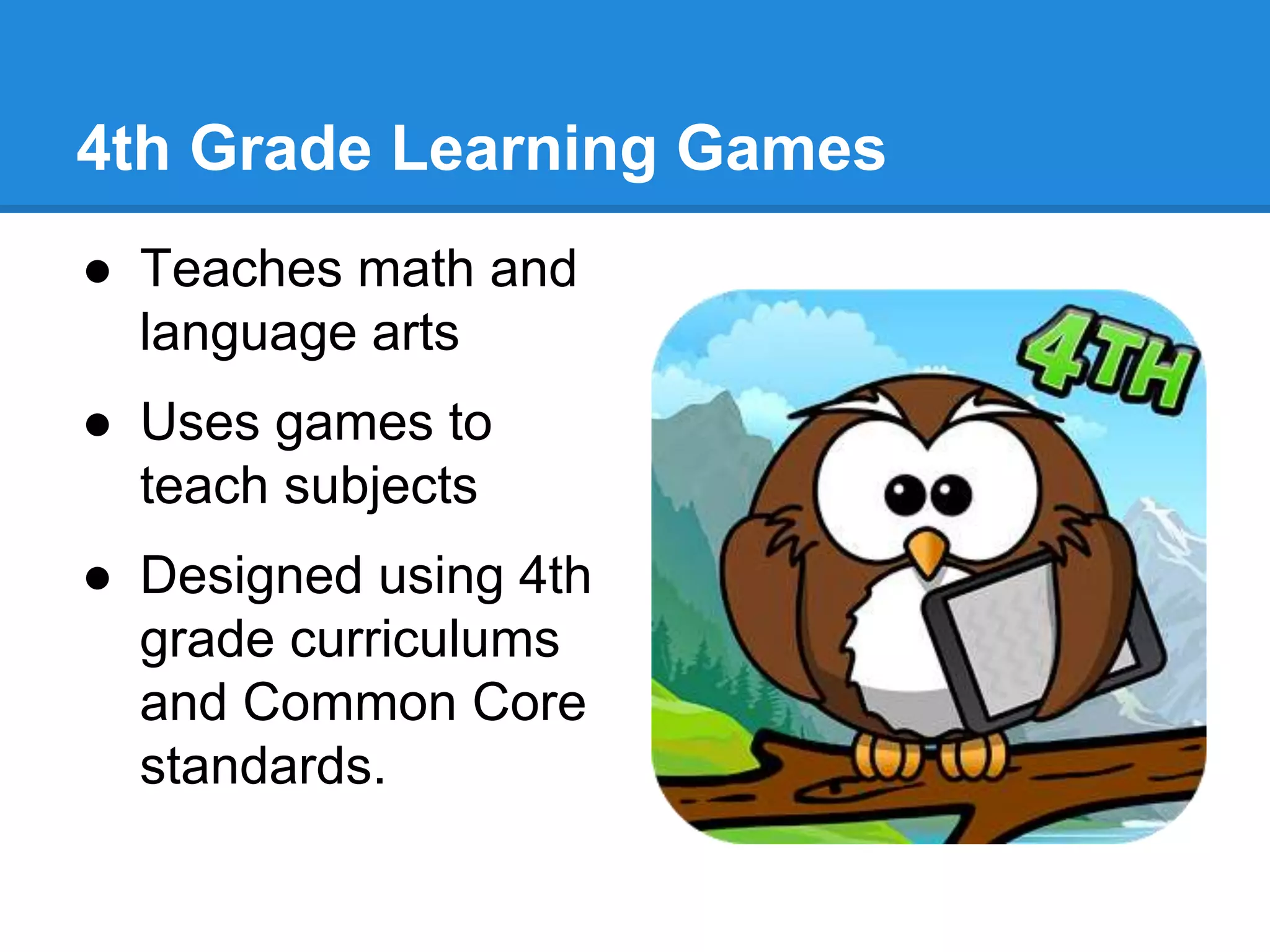 The document describes several educational apps for students including 4th Grade Learning Games, Stack the States, 4th Grade: Common Core, Science Quest- 4th Grade, Mathmateer, BrainPOP Featured Movie, Toontastic, World Atlas By National Geographic, Rainbow Sentences, and instaGrok. These apps cover subjects like math, language arts, science, geography and more. They use games, quizzes, interactive maps and animations to teach in fun and engaging ways while meeting common core standards. Some apps allow student progress tracking and sharing of work.