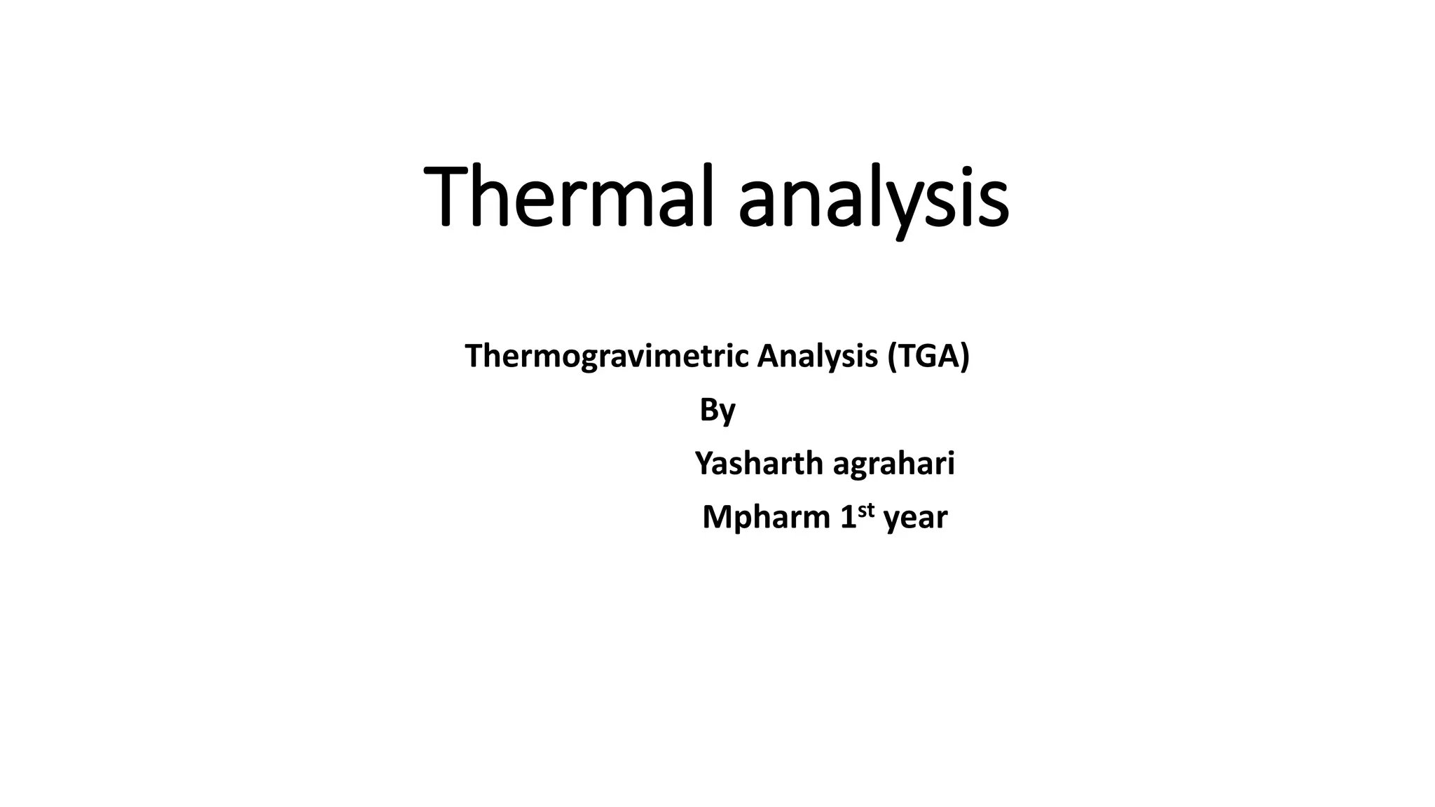 Thermogravimetric analysis (TGA) measures how the weight of a material changes as it is heated. During TGA, a sample is heated at a controlled rate while measuring its weight change. Physical changes like phase transitions and chemical changes like decomposition can be identified by changes in the weight of the sample over temperature. TGA curves plot weight change versus temperature. TGA is used to determine material properties over a range of temperatures, characterize materials and chemical compositions, and identify reaction kinetics. The sample environment, heating rate, and sample size can affect TGA results. Common applications include determining purity and thermal stability, analyzing complex mixtures, and studying catalysts.