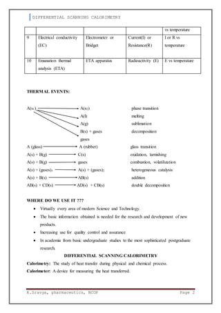 Differential scanning calorimetry (DSC) is a thermal analysis technique that measures the heat flow into or out of a sample as it is heated, cooled, or held at constant temperature. DSC directly measures the energy required to establish a zero temperature difference between a sample and an inert reference material as both are subjected to an identical temperature program. This allows the determination of transition temperatures such as melting points and glass transition temperatures. DSC is commonly used in pharmaceutical analysis to characterize materials such as purity determination, polymorphism detection, and stability studies. The basic components of a DSC instrument include sample and reference pans, a furnace to heat the pans at a controlled rate, and sensors to measure the heat flow difference between