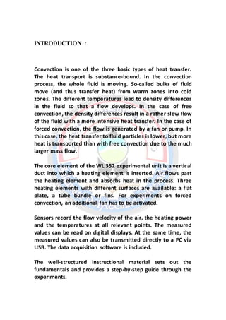 1. This document describes a laboratory experiment on thermal convection. The experiment uses a benchtop unit with an air duct, heating elements of different shapes, and sensors to study free and forced convection.