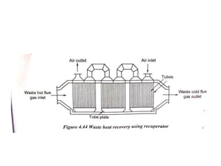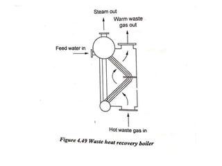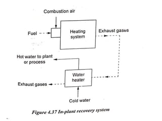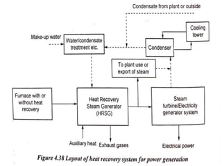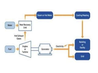 Cogeneration or combined heat and power (CHP) involves generating electricity and useful heat simultaneously. It is used in prisons, hospitals, data centers, industrial units, and other applications. Cogeneration improves efficiency, reduces costs and emissions, and is more economical than conventional power plants. Waste heat recovery units transfer heat from high-temperature processes to increase efficiency further. Cogeneration can achieve up to 80% efficiency and provides environmental and economic benefits.