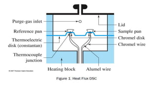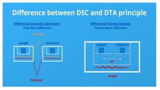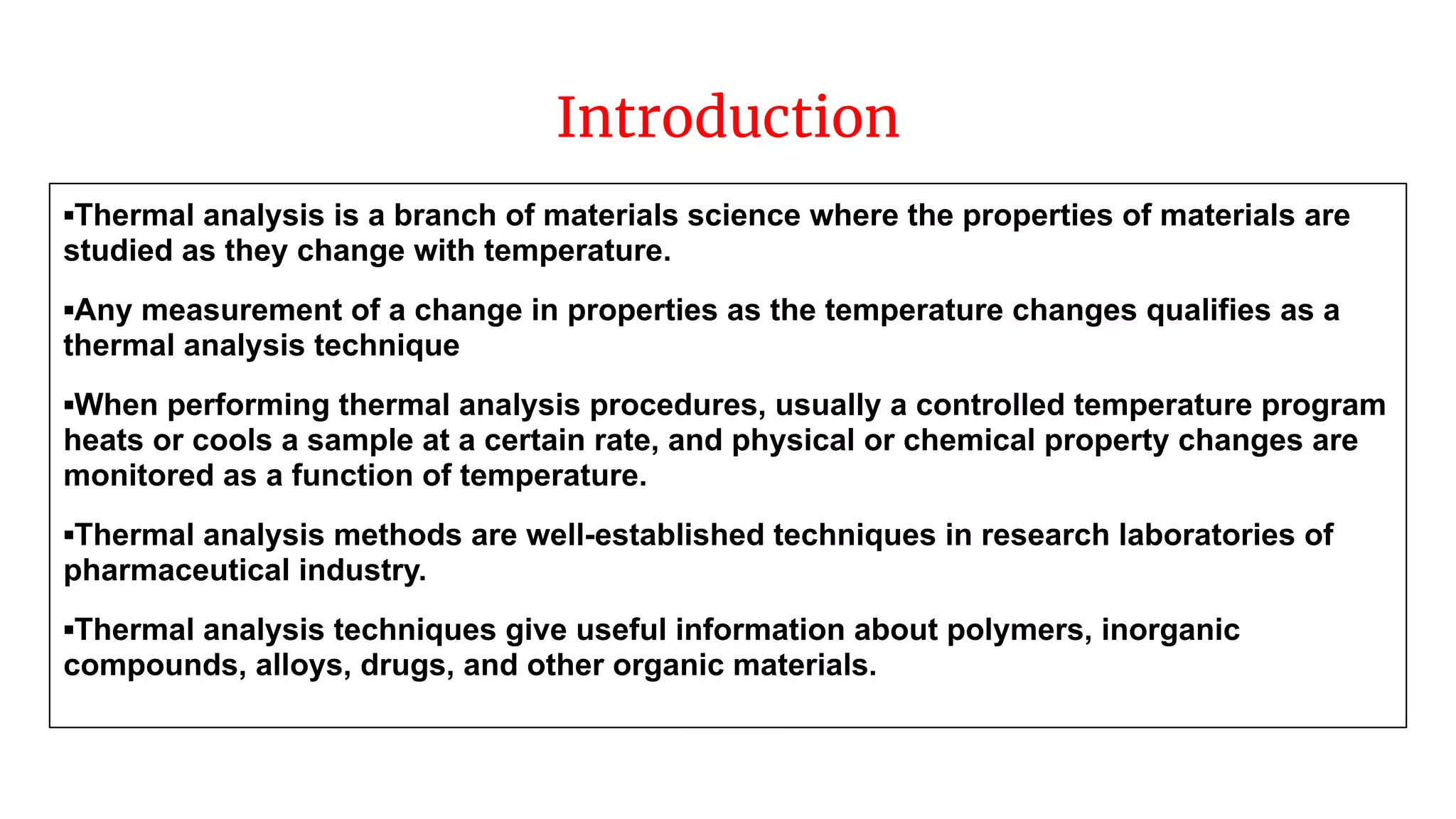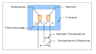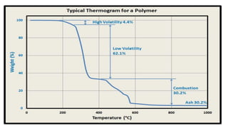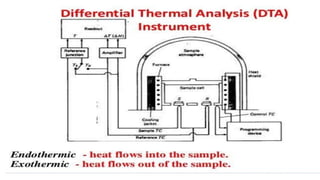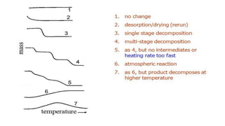 The document discusses thermal methods of analysis, particularly focusing on techniques like thermogravimetry (TG), differential thermal analysis (DTA), and differential scanning calorimetry (DSC), explaining their principles, instrumentation, and applications in the pharmaceutical industry. It details how these techniques measure material properties as they change with temperature and provides insights into the analysis of polymers, inorganic compounds, and organic materials. Additionally, it covers the factors affecting the results, including instrumental effects and sample characteristics, and outlines the importance of thermogravimetric curves in characterizing material stability and decomposition behavior.