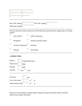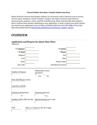 Stelter & Brinck offer thermal and catalytic oxidizers for industries such as cement, ceramics, glass, and chemicals to control VOC emissions. These oxidizers can operate with or without heat recovery depending on the application. To determine which oxidizer is suitable, users can contact Stelter & Brinck or fill out an online data sheet requesting information about their emissions and facility utilities.