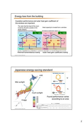 This document discusses window thermal performance evaluation standards in Japan. It provides an overview of the Japanese Industrial Standards (JIS) for windows, including JIS A4706 which establishes product specifications and performance levels. It also describes WindEye, an evaluation tool used in Japan to calculate the thermal transmittance and solar heat gain coefficient of windows based on their components. WindEye utilizes a database of base performance data for frames, glass, and shading devices to output evaluation results for window configurations. It provides an easy to use, free, and regularly updated resource for assessing window energy efficiency.