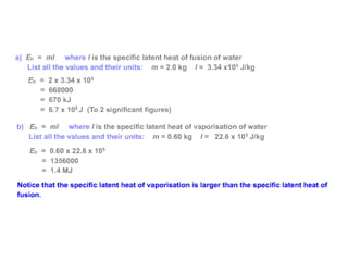 This document discusses key concepts in thermal physics including heat, temperature, specific heat capacity, and latent heat. It begins by defining heat as a form of energy and temperature as a measurement of how hot or cold something is. It explains that different materials require different amounts of heat to change temperature by the same amount due to differences in specific heat capacity. The document then discusses phase changes and how heat is required for changes of state, like melting and boiling, without a change in temperature due to the absorption of latent heat. It provides examples of calculating specific heat capacity and using the principle of conservation of energy to solve problems involving heat transfer.