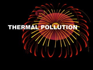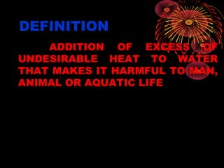 Thermal pollution is defined as the addition of excess heat to water that makes it harmful to aquatic life. Thermal pollution is caused by the discharge of heated water or hot waste material into water bodies from various sources like nuclear power plants, industrial effluents, domestic sewage, hydroelectric power plants, and coal fired power plants. The document discusses the impacts of thermal pollution from these sources and some control measures that can be implemented like cooling towers, cooling ponds, spray ponds, and artificial lakes.