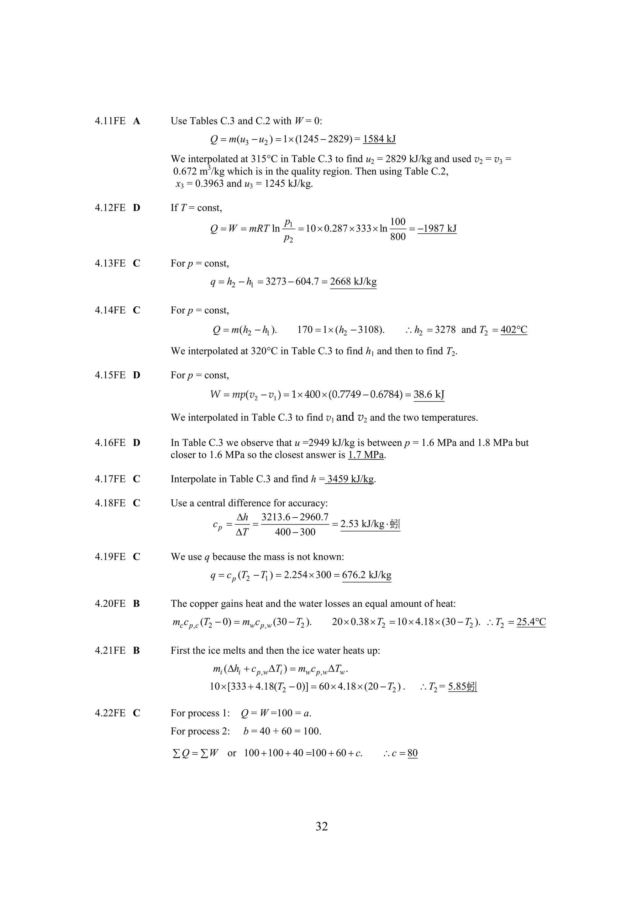 The document discusses various concepts and calculations related to the first law of thermodynamics, focusing on processes involving heat transfer, work, and internal energy changes in thermodynamic systems. It includes specific computations for adiabatic processes, superheated steam, and interpolations using thermodynamic tables. The calculations illustrate principles such as heat loss, energy conservation, and temperature changes in rigid containers under different conditions.