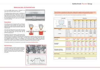 The document provides specifications for welding various sizes of crane rails using the Thermit SkS welding process. This process uses a three-piece preformed mould and extended preheating, followed by a central pour of molten steel, to ensure full fusion across the rail profile. Operating parameters like rail dimensions, welding consumables, preheating times and temperatures, and dismantling times are given for different rail types to achieve welds with compatible metallurgy to the parent rail.