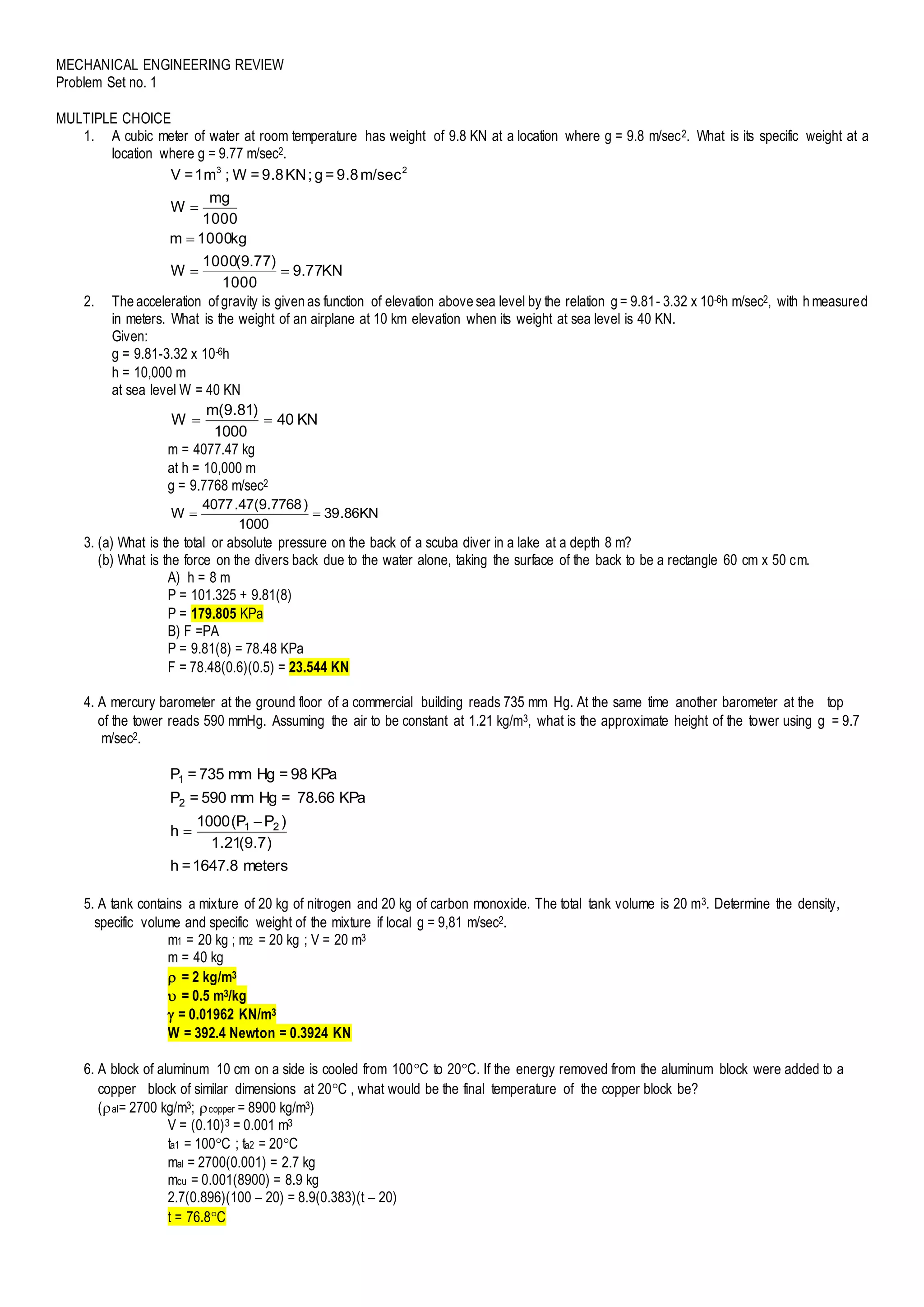 This document contains a 16 question multiple choice mechanical engineering review problem set. It covers topics including: specific weight calculations, changes in weight due to elevation, pressure and force calculations for scuba diving, determining height using barometer readings, properties of gas mixtures, heat transfer between materials, gas turbine processes, combustion calculations, and thermodynamic processes including changes in temperature, pressure, volume, entropy and heat/work.