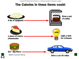 2. Calorimetry is used to determine the energy content of substances by measuring heat changes. Specific heat and heat capacity allow calculation of heat from temperature changes.
