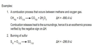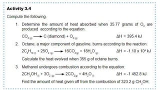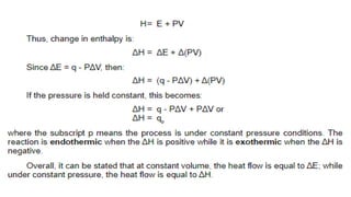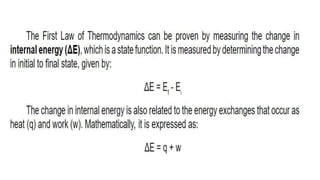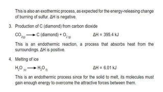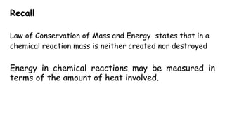 Thermochemistry is the study of heat energy associated with chemical reactions and physical transformations. A reaction may release or absorb energy during these processes. There are two types of energy: kinetic energy which is energy in motion, and potential energy which is energy at rest. The first law of thermodynamics states that energy is neither created nor destroyed, just changed from one form to another. Enthalpy (H) is a measurement of the total energy of a chemical reaction. Hess's law says the enthalpy change of a reaction is independent of the pathway taken and depends only on the initial and final states.