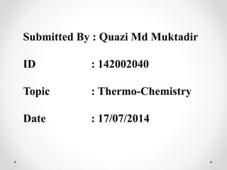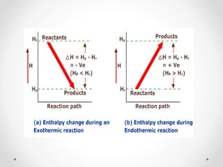 The document discusses thermochemistry, which is the study of energy and heat in chemical reactions and physical transformations, emphasizing concepts like exothermic and endothermic reactions. It outlines different types of heat reactions, including heat of formation, decomposition, combustion, and neutralization, along with Hess’s law, stating that total enthalpy change remains consistent regardless of the reaction path. Graphical representations illustrate energy changes for these reactions, detailing how energy is absorbed or released during chemical processes.