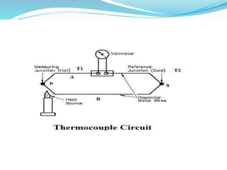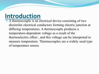 A thermocouple is an electrical device consisting of two dissimilar metals joined together that produces a voltage dependent on the temperature difference between the junctions. Thermocouples operate based on the Seebeck effect and Peltier effect to measure a wide range of temperatures from -270°C to 3000°C. They are commonly used to monitor temperatures in industrial processes like kilns but are less accurate than other sensors for measuring small temperature differences with high precision.