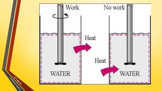 The document discusses the first and second laws of thermodynamics and provides examples of each. It defines the first law as stating that energy cannot be created or destroyed, only transferred or changed in form. Examples of applications of the first law include isothermal, isochoric, isobaric, and adiabatic processes. The second law is defined as heat not being able to spontaneously flow from a colder to a hotter body without external work. Both the Kelvin-Plank and Clausius statements of the second law are described as indicating it is impossible to have a cyclical heat engine or heat pump with 100% efficiency or one that transfers heat from a lower to higher temperature body without external work.