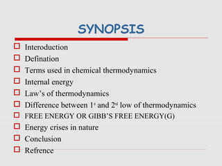 The document is a synopsis on thermodynamics by Dr. Rachana Choudhary covering fundamental concepts such as energy changes in chemical reactions, the laws of thermodynamics, and entropy. It discusses the differences between the first and second laws, as well as Gibbs free energy and its implications on spontaneity in processes. Conclusively, it outlines the significance of thermodynamic principles in understanding energy transformations throughout various processes.