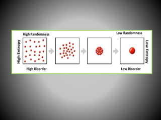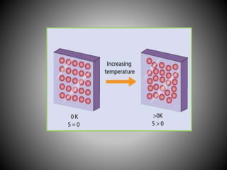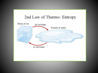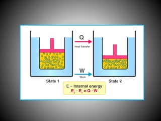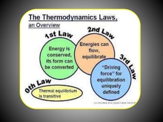 Thermodynamics deals with heat, temperature, and their relation to energy and work. It has four main branches: classical thermodynamics studies whole systems, statistical thermodynamics analyzes properties at a molecular level, equilibrium thermodynamics considers approaching equilibrium, and chemical thermodynamics relates heat and work to chemical reactions. The four laws of thermodynamics establish foundational concepts. The first law concerns conservation of energy, the second law involves increasing entropy, and the third law states that entropy approaches zero as temperature approaches absolute zero. Thermodynamic properties like internal energy, enthalpy, and entropy are defined in terms of heat and temperature.