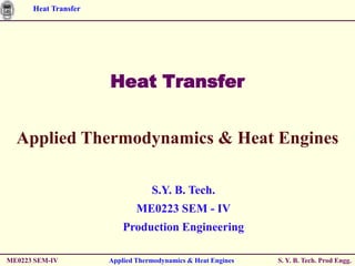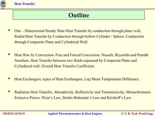The document discusses heat transfer through conduction, convection and radiation. It covers key concepts like Fourier's law of heat conduction, thermal conductivity of solids, liquids and gases, one dimensional and radial heat conduction, and heat transfer through composite walls. It also provides examples of calculating heat transfer through plane and cylindrical walls, determining the required thickness of insulation, and calculating critical thickness of insulation.