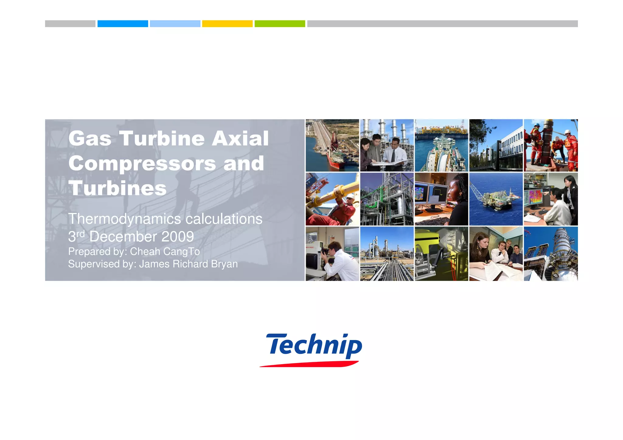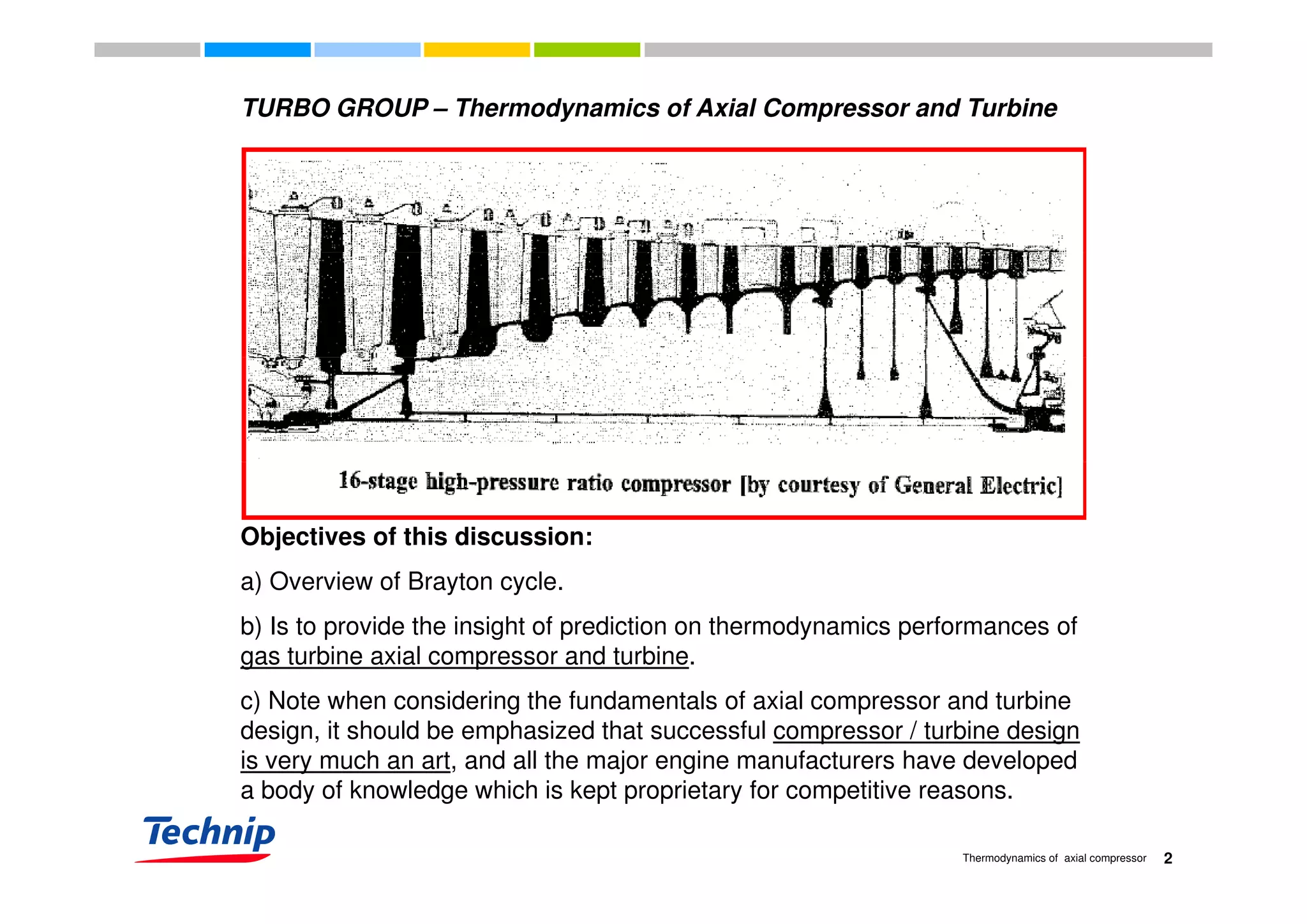 This document discusses the thermodynamics of axial compressors and turbines used in gas turbines. It provides an overview of the Brayton cycle and discusses how to calculate the shaft power required for compression, temperature rises in the compressor, and outlet temperature as a function of pressure ratio, inlet temperature, and isentropic efficiency. Higher compression ratios are desirable because they increase turbine efficiency and overall gas turbine efficiency, though the rate of efficiency improvement decreases at higher ratios. Designing high-efficiency machines requires balancing increased efficiency from high compression against diminishing returns.