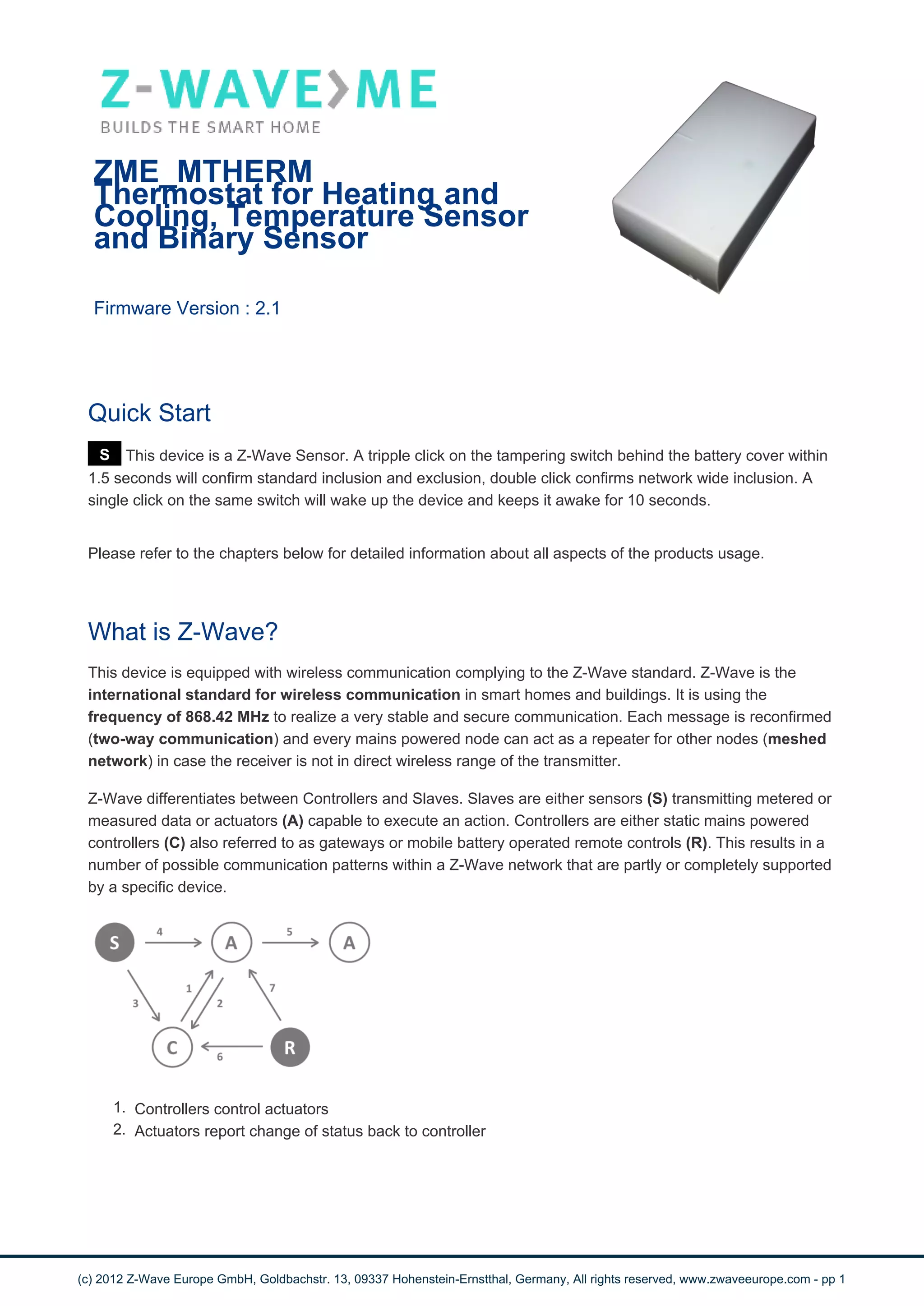 This document provides instructions for a Z-Wave thermostat and sensor device. The device can measure temperature, detect binary sensor states, and control heating devices as a thermostat. It communicates using the Z-Wave wireless protocol and operates on batteries. The summary includes instructions for inclusion, exclusion, configuration, and operating the temperature, binary sensor, and thermostat functions.