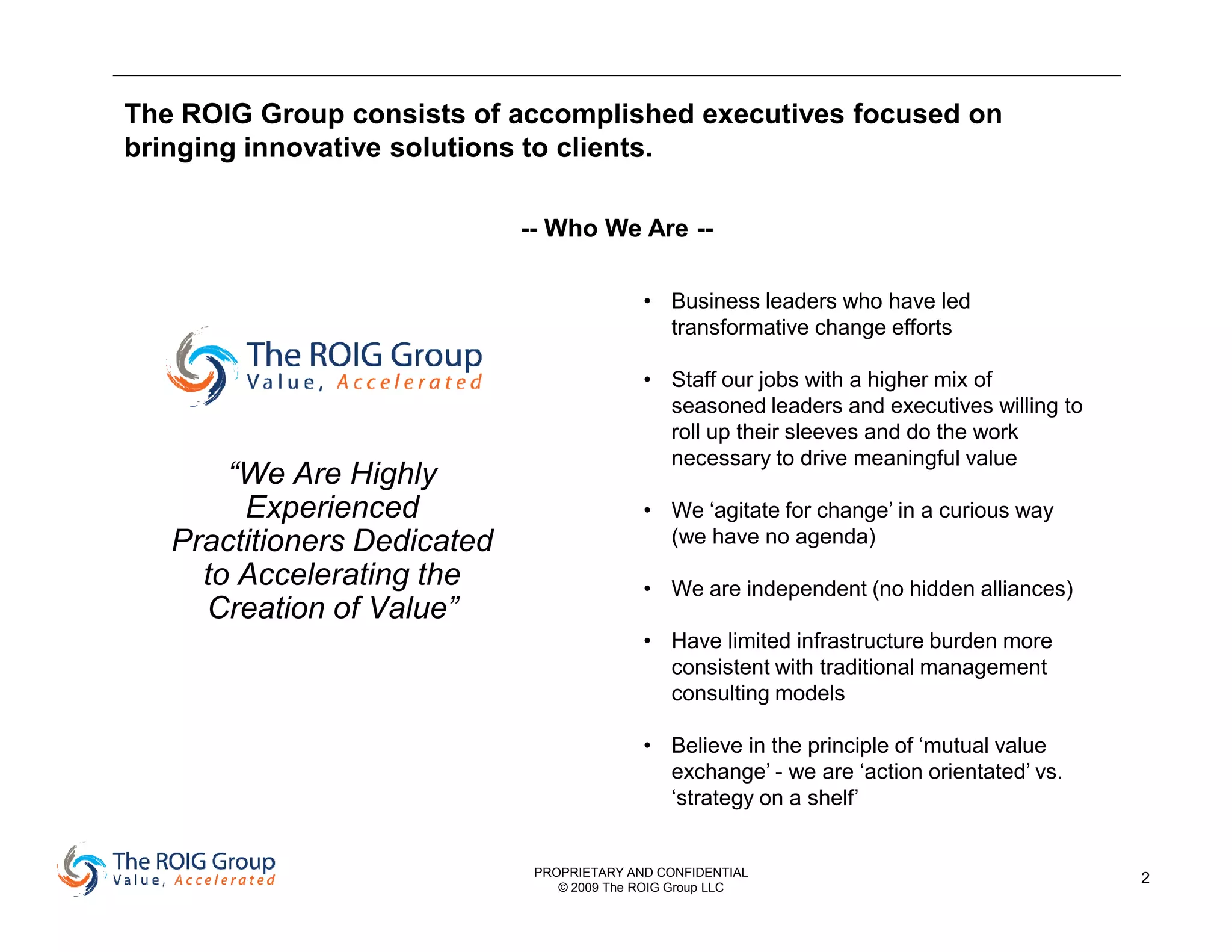 The ROIG Group consists of experienced business leaders focused on bringing innovative solutions to clients. They staff projects with seasoned executives who are willing to do the necessary work to drive value. They believe in mutual value exchange and helping clients accelerate the creation of value through their four practices: Revive, Optimize, Innovate, and Grow. Their experienced practitioner model combines industry and consulting experience to accelerate benefit realization for clients.
