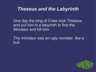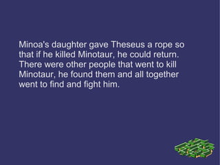 Theseus was sent by the king of Crete into the labyrinth to kill the Minotaur, a monster that was half man and half bull. With the help of a rope from the king's daughter and other prisoners, Theseus was able to find and slay the Minotaur. Upon returning home victorious, Theseus forgot to change the ship's sails to white and his father, believing him dead, committed suicide by jumping into the sea.