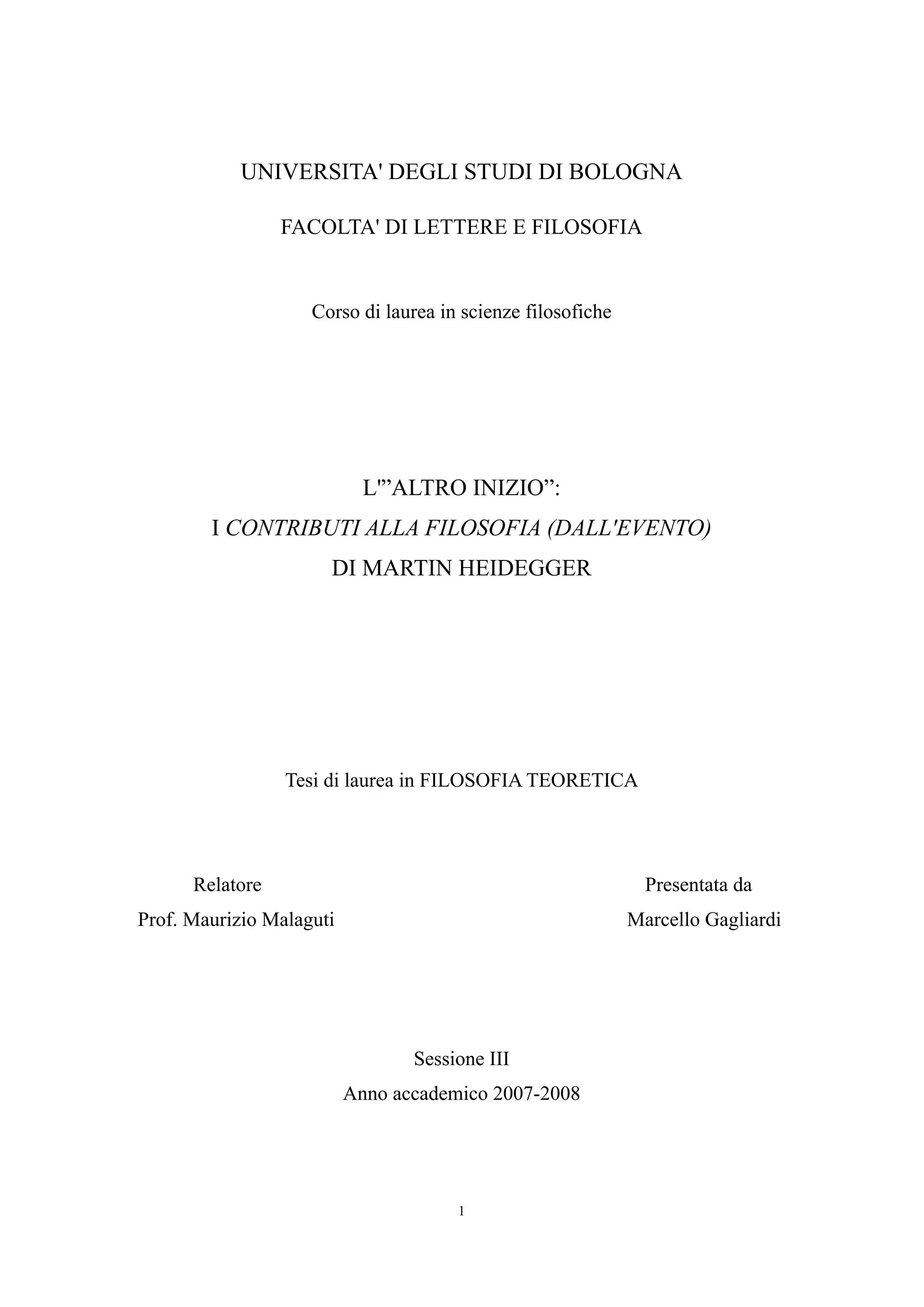 La tesi analizza i 'Contributi alla filosofia' di Martin Heidegger, sottolineando la problematicità e la complessità del testo. Si discute la necessità di superare le interpretazioni metafisiche per cogliere il profondo significato della filosofia heideggeriana, centrata sull'essere come evento. L'opera rappresenta un importante passaggio nel pensiero di Heidegger, segnando una svolta verso una nuova visione della filosofia e della storia dell'essere.