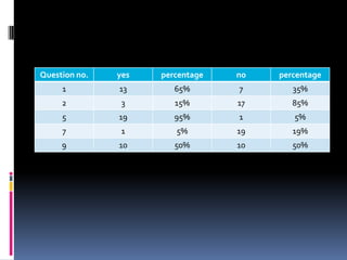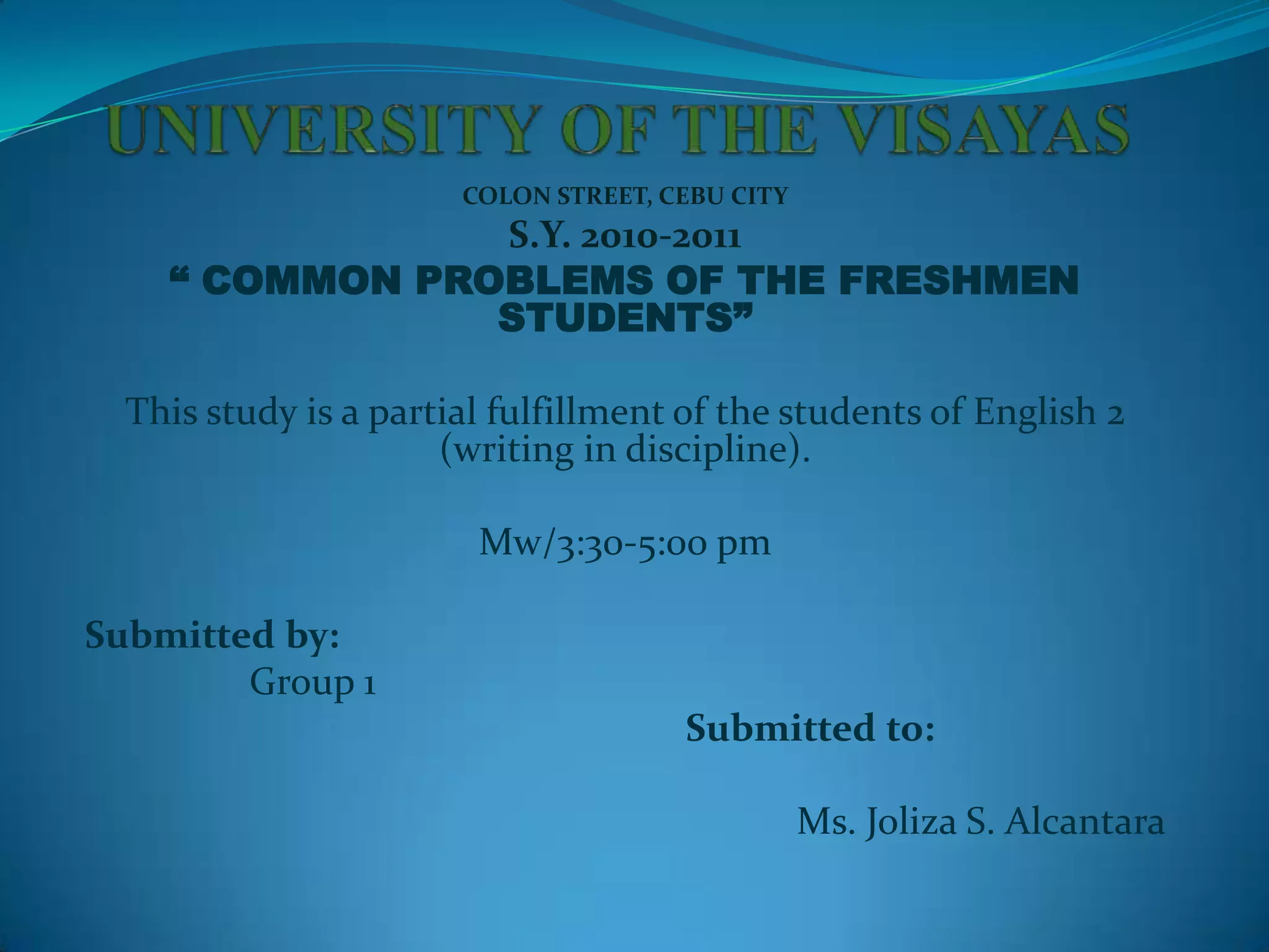 The study examined the common problems faced by freshmen students at the University of the Visayas. Through surveys, the researchers found that the top problems were financial/money issues, difficulty balancing work and studies, depression from being away from home, and lack of interest in certain subjects. The researchers aimed to identify ways to help students overcome these challenges in order to encourage them in their studies and build self-confidence.