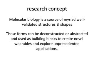 This document discusses exploring the deconstruction of biological structures and forms from molecular biology to use as building blocks for novel wearable designs. It considers how geometric elements from viruses and other biological sources can be abstracted while maintaining certain constants or allowing some variation. Potential applications and target users are mentioned, as well as prototypes from other designers working at the intersection of biology and fashion. Challenges and opportunities for taking the concept forward are also outlined.