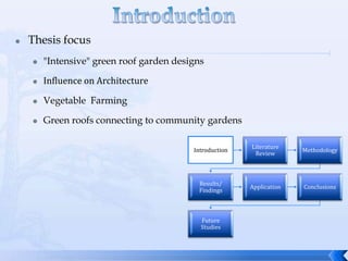 This document discusses the design of intensive green roofs for urban vegetable farming. It begins with an introduction and literature review on extensive vs intensive green roofs and their benefits. Case studies are presented and interviews conducted to identify design considerations like weight loads, pest control, and stormwater management. Design guidelines are proposed based on the research, including conducting site analysis, applying irrigation and stormwater systems, providing public access and growing space, addressing safety, and connecting roofs to community gardens. The document concludes with implications for further research on roof top farming's influence on natural communities and human psychology.