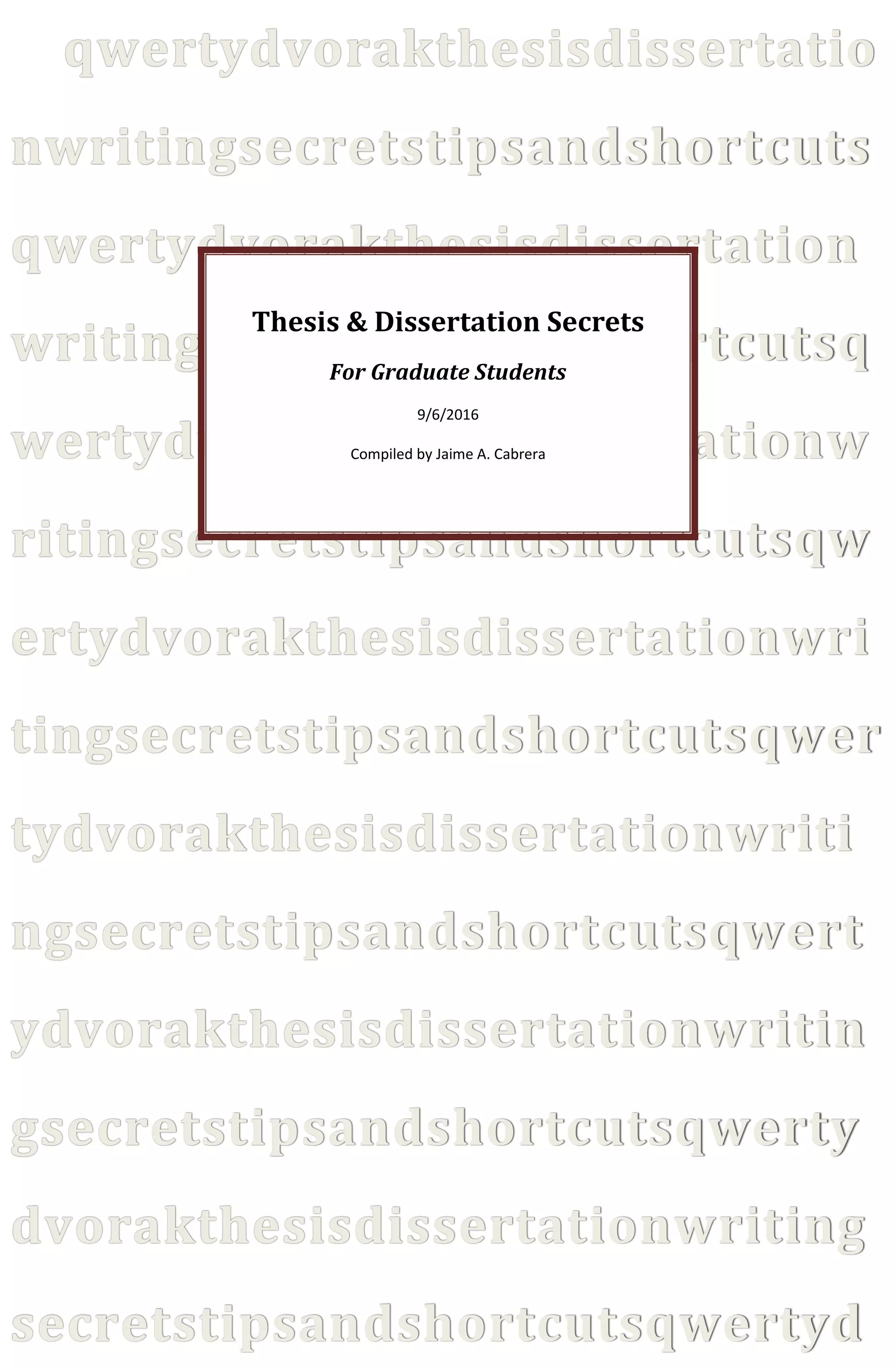 This document provides advice and strategies for writing a thesis or dissertation. It discusses establishing a regular writing routine of at least a few hours per day to make consistent progress. It emphasizes that writing is thinking - the process of writing will help generate new ideas. It also addresses common psychological obstacles to completing a dissertation and provides tips for overcoming procrastination and feelings of being overwhelmed by the large project. The document stresses focusing on small, manageable goals and outputting written work regularly in order to eventually complete a full draft.