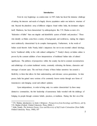 This document provides a summary of the Ramayana epic from India. It discusses how the Hindu Right in modern India has used the Ramayana to promote a singular cultural narrative and define Indian national identity. However, the Ramayana story has many regional variations in plot details and themes. The document analyzes how the Hindu Right's promotion of one version as authentic simplifies India's diverse cultural traditions and excludes religious minorities.