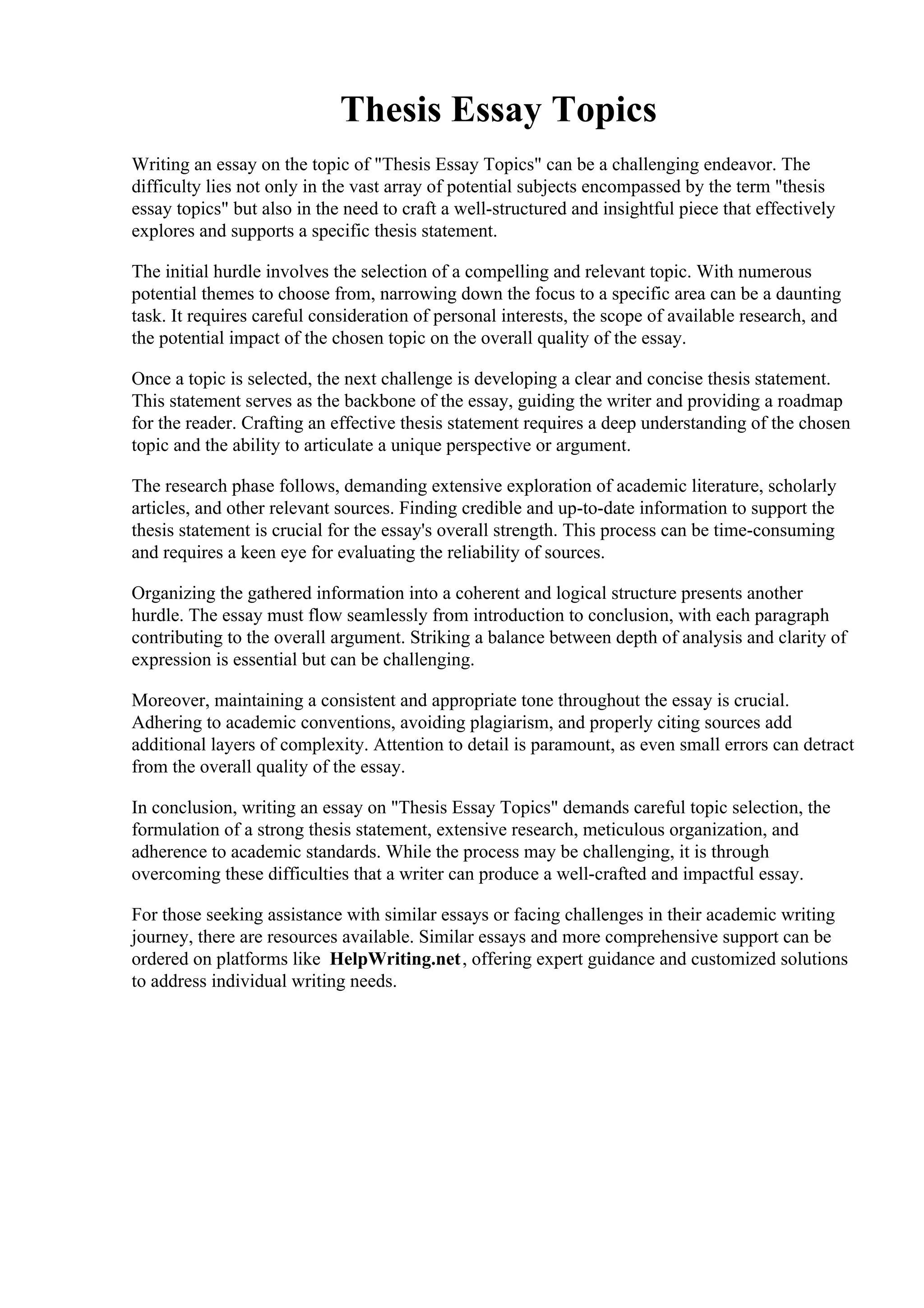 The document discusses the challenges of writing an essay on 'thesis essay topics,' emphasizing the importance of selecting a compelling topic, crafting a clear thesis statement, conducting extensive research, and organizing information coherently. It also highlights the complexity of adhering to academic conventions and the attention to detail required to produce a high-quality essay. Additionally, resources for academic writing assistance are mentioned, including platforms that offer expert guidance.