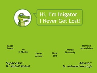 This document summarizes a project to develop an indoor navigation application called "Inigator" that uses image matching to locate a user and guide them to their destination on a map. Key aspects discussed include using a database of images and locations, finding the shortest path for navigation, challenges of image matching and scaling, and plans for future improvements to the system such as automatic image collection and outdoor GPS.