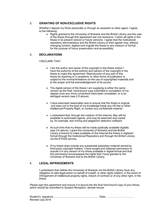 This document summarizes the key points of a library declaration and deposit agreement for a thesis submitted to the University of Warwick. It requires the student to provide their details and select an option for depositing their thesis. The thesis must be deposited in both hard copy and digital format. By default, the digital copy will be made publicly accessible online immediately through the university's institutional repository and the British Library. The student grants non-exclusive rights to the university and library and declares they are the owner or have permission to deposit the thesis. They understand it may be searched and copied online. The document is signed by the student to be bound with their final thesis.