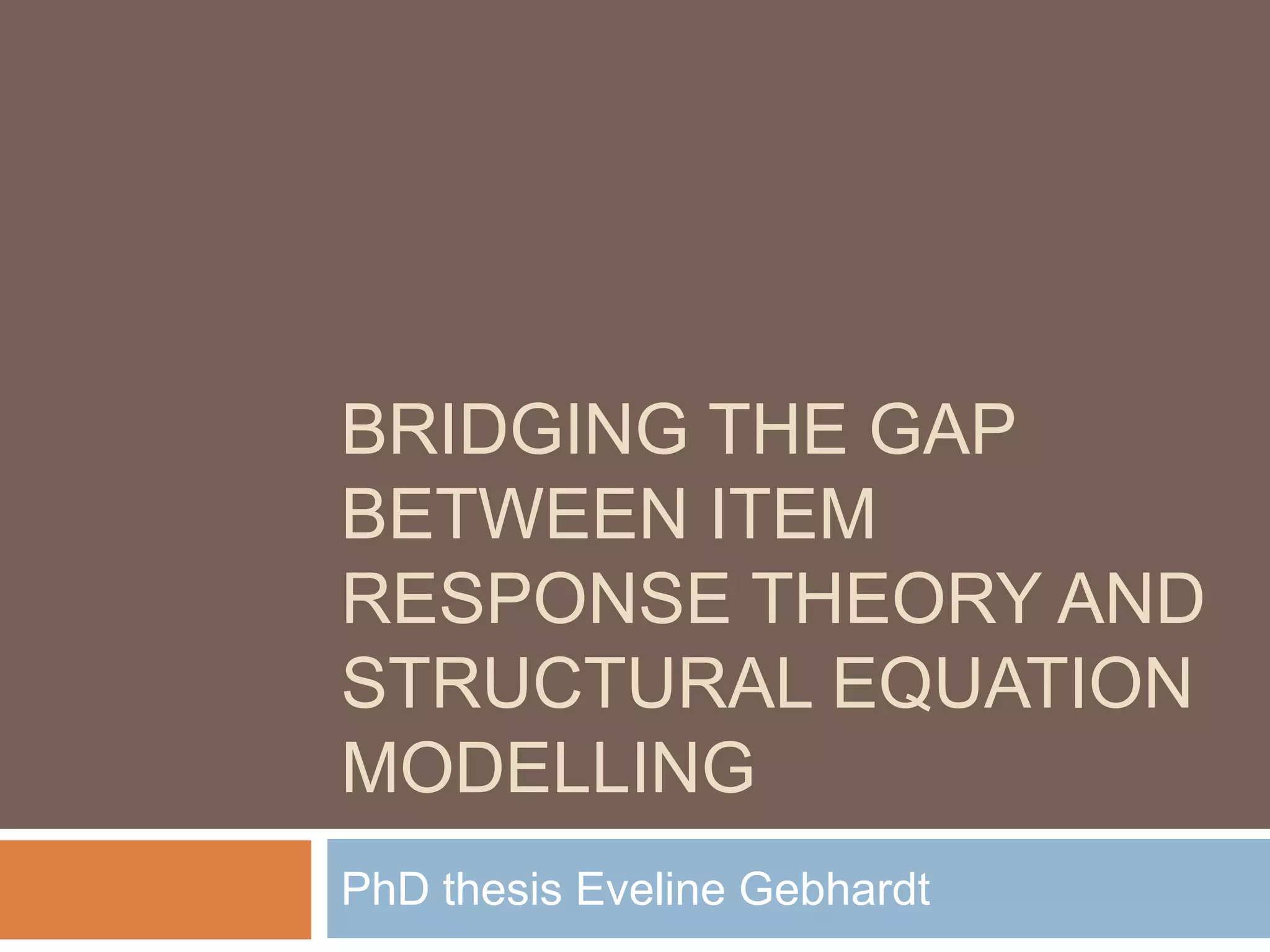 This document describes a PhD thesis that aims to bridge the gap between item response theory (IRT) and structural equation modeling (SEM). It discusses how the two approaches are formally equivalent but have some differences in their measurement and structural models. The thesis involves describing matching IRT and SEM models, estimating structural models in SEM using two-stage least squares, and adding structural features to current IRT models. A simulation study is used to evaluate the accuracy of structural parameter estimates from a multi-step approach compared to true parameters and estimates from other software programs. Results show the regression coefficients, R-squared values, and standard errors are estimated accurately.