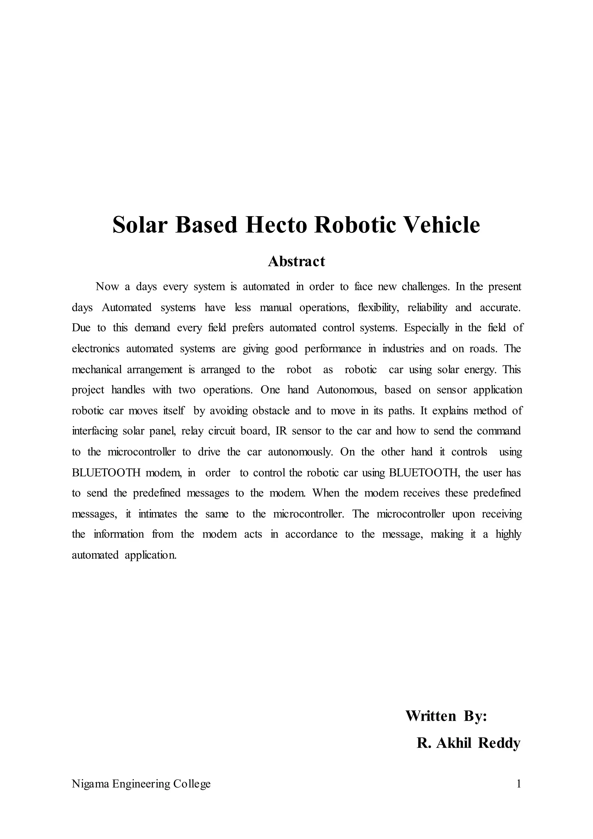 The document presents a solar-based robotic vehicle project developed at Nigama Engineering College, which autonomously navigates using sensors and can also be controlled via Bluetooth. It details the system's design, including the interfacing of a solar panel, relay circuit, and microcontroller for driving the car, alongside the challenges of solar energy dependency. Additionally, it discusses embedded systems and the essential components like power supply and rectifiers involved in the operation of the robotic vehicle.