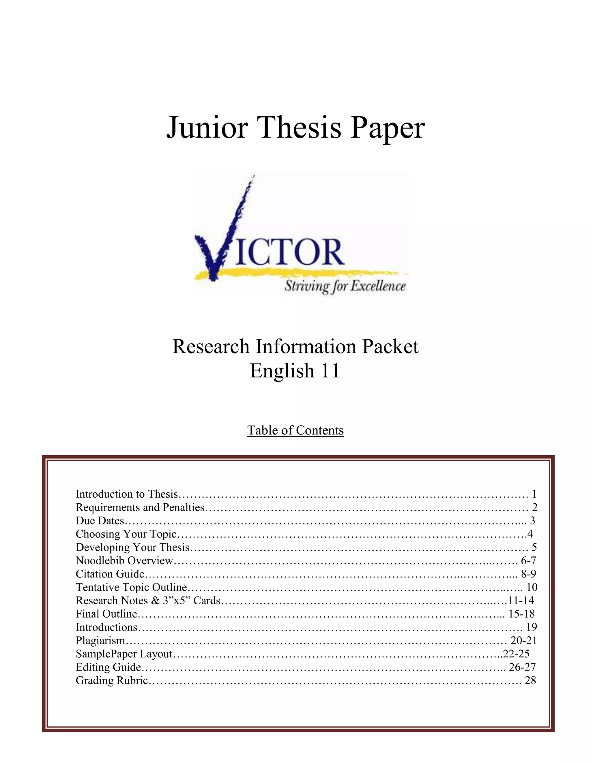 This document provides guidelines and requirements for students completing their junior thesis paper. It includes sections on choosing a topic, developing the thesis, research methods like using note cards, creating an outline, issues of plagiarism, the paper layout, and grading rubric. Key due dates are listed for submitting initial and final drafts as well as completing outline and research checkpoints along the way. Students are expected to independently research and write a 5-7 page persuasive paper on a topic that interests them and can be adequately supported within the given timeframe.