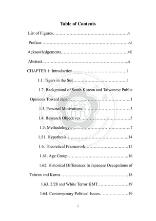 This document is the thesis of Daniel Josephson titled "Tigers in the Sun: South Korean and Taiwanese people's opinions toward Japan". It examines differences in public opinion between South Koreans and Taiwanese regarding Japan through surveys and interviews. The thesis analyzes how historical factors like Japanese colonial rule and authoritarian regimes in both countries differently impacted their views of Japan. It also discusses contemporary political issues like territorial disputes that influence current geopolitical opinions. The thesis uses both qualitative and quantitative data to understand the split in public opinion between the two countries.
