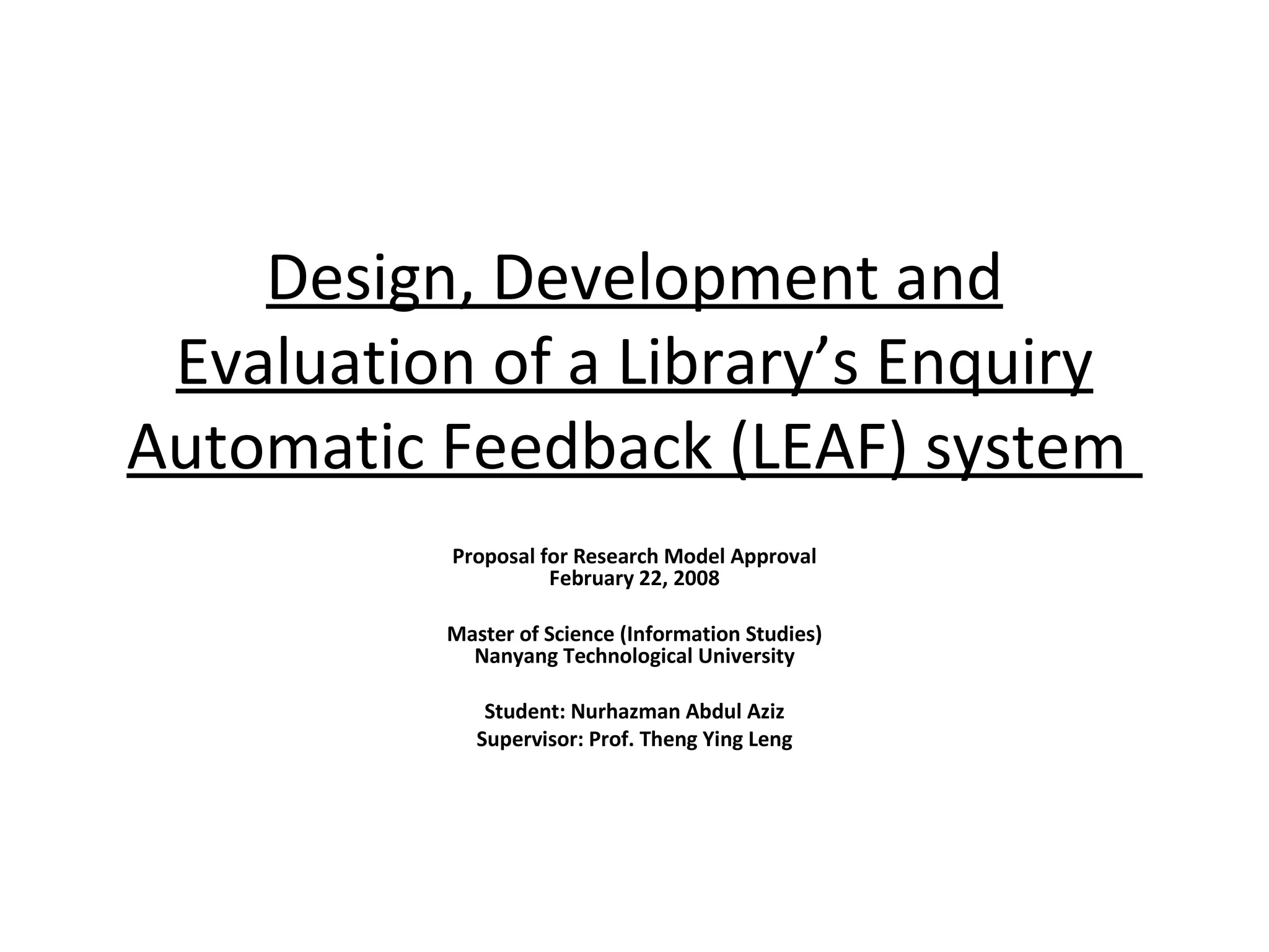 The document presents a proposal for the development of an automatic feedback system for library inquiries, aiming to enhance user interaction and accessibility through a customized platform. It discusses the application of the technology acceptance model and the LibQUAL framework in evaluating the system while exploring the integration of social computing and knowledge services. The end goal is to create a user-friendly interface that fosters community engagement and continuous improvement.