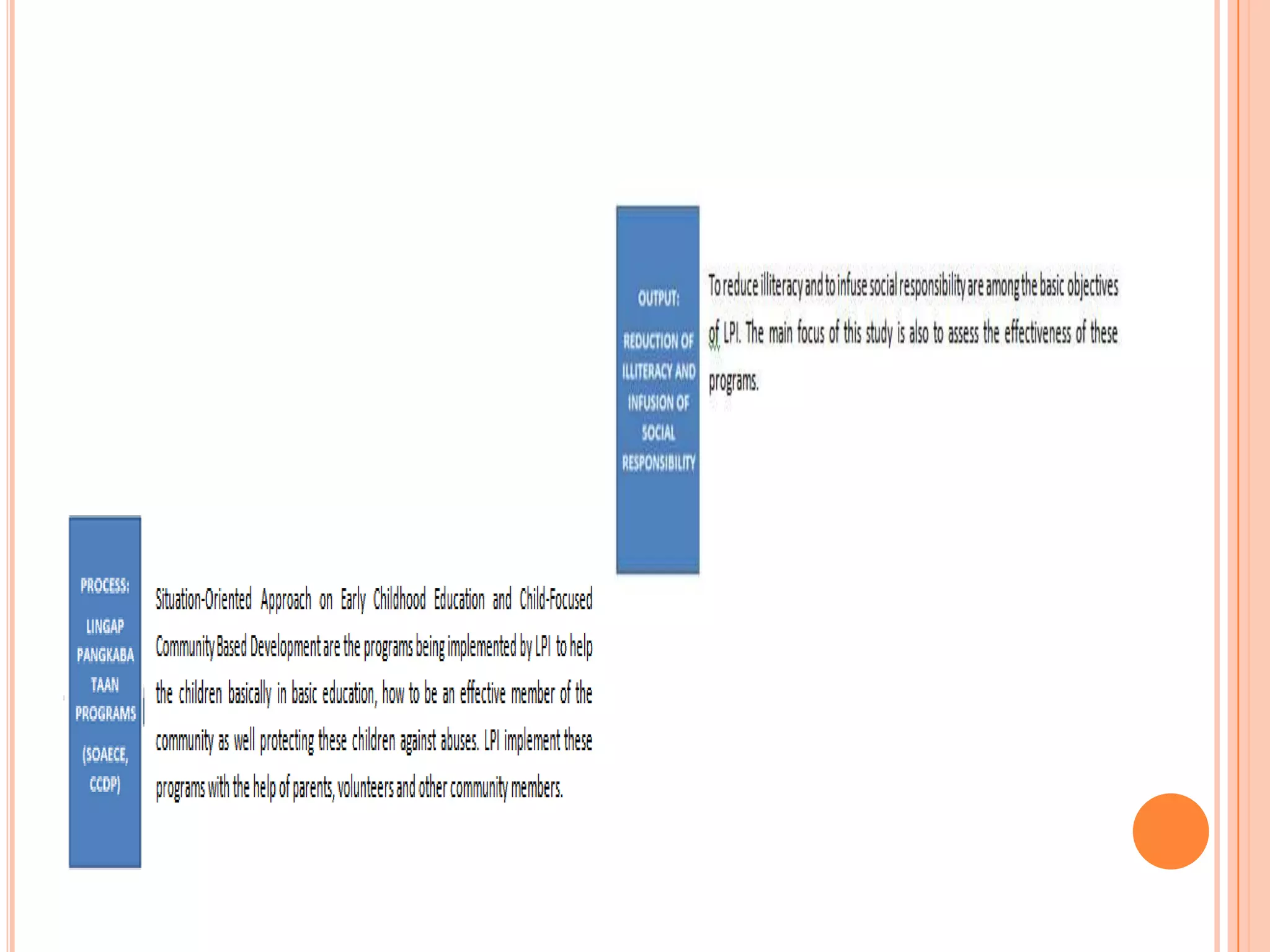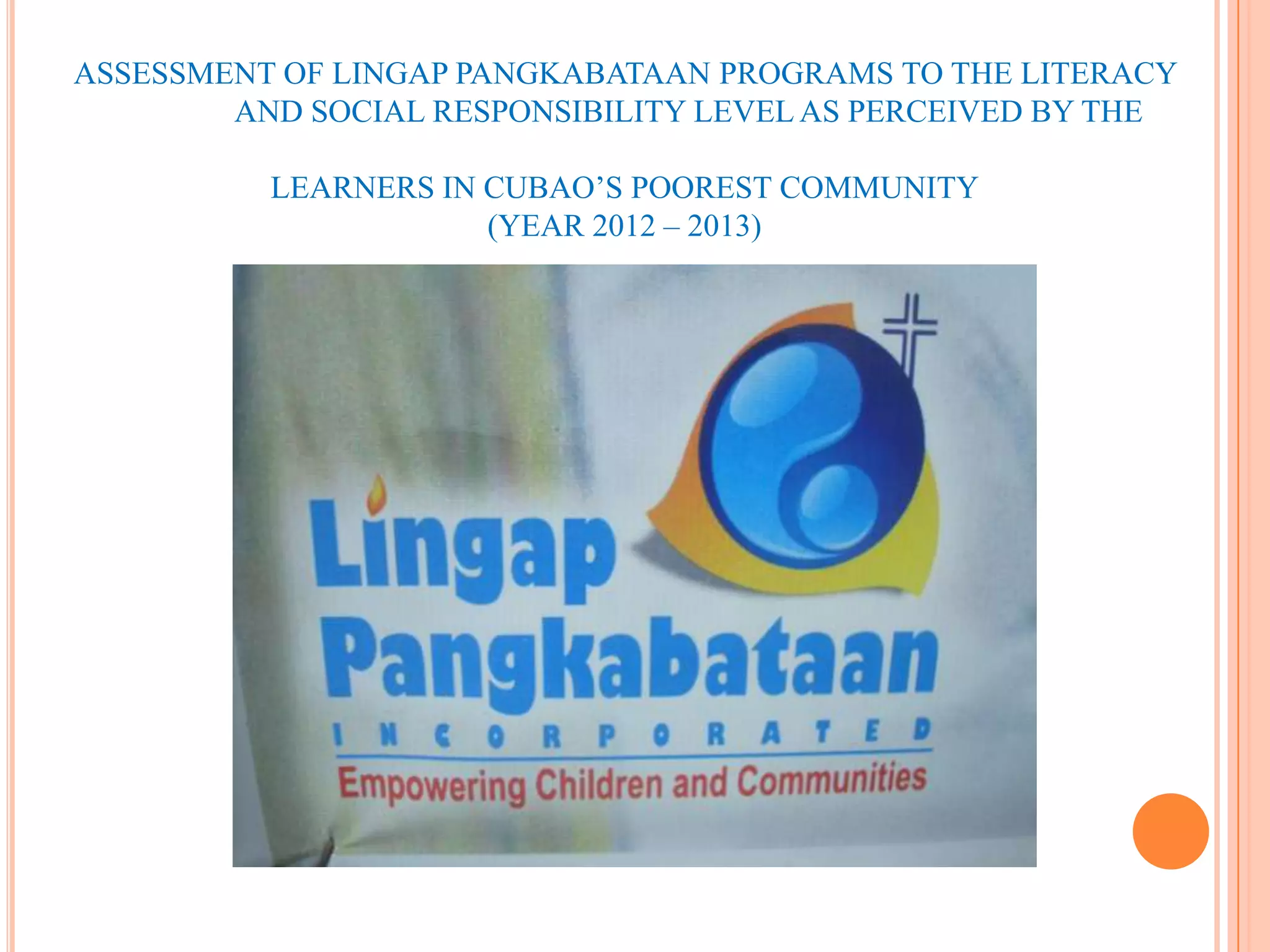The document discusses an assessment of literacy and social responsibility programs conducted by Lingap Pangkabataan for learners in Cubao's poorest community from 2012-2013. It provides background on issues of illiteracy globally and in the Philippines. The study uses Kurt Lewin's field theory and social responsibility theory as a framework to evaluate the impact of Lingap Pangkabataan's programs on literacy levels and social values. The research methodology is described, including population sampling, data collection instruments, and statistical analysis used to test the relationship between literacy and social responsibility.