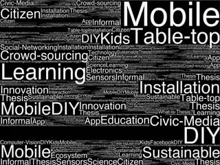This document outlines the methodology for a thesis research project. It discusses researching collective intelligence and how mobile technologies can enable collaboration. It presents initial research questions and reviews similar projects involving citizen sensors, crowd-sourcing, and social networking. An initial tip jar prototype aimed to encourage idea sharing but was not very successful, highlighting lessons about needing incentives and specific goals. The document proposes designing cultural probes and a next prototype involving documenting tasks in a city to further the research.