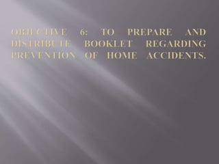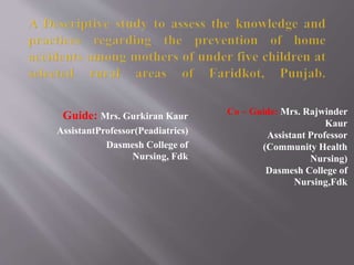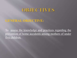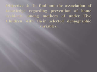 The document outlines the objectives and methodology of a study assessing knowledge and practices regarding home accident prevention among mothers of under-five children in rural Faridkot, Punjab. The study aimed to assess knowledge and practices, examine their relationship, and determine associations with demographic variables. It found most mothers had adequate knowledge but unsatisfactory practices, with a moderate correlation between the two. Mothers' education was significantly associated with knowledge but not practices. The age of children was significantly associated with practices but not knowledge.