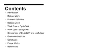 This document discusses data augmentation techniques for improving plant disease diagnosis using deep learning models. It presents work done using CycleGAN and a proposed LeafyGAN model. CycleGAN was able to generate new images but had limitations like changing backgrounds. LeafyGAN segmented leaves first before generation and produced higher quality images with more similar features compared to the originals, as measured by FID and SSIM metrics. The document concludes LeafyGAN may be a promising alternative to CycleGAN for image generation tasks.